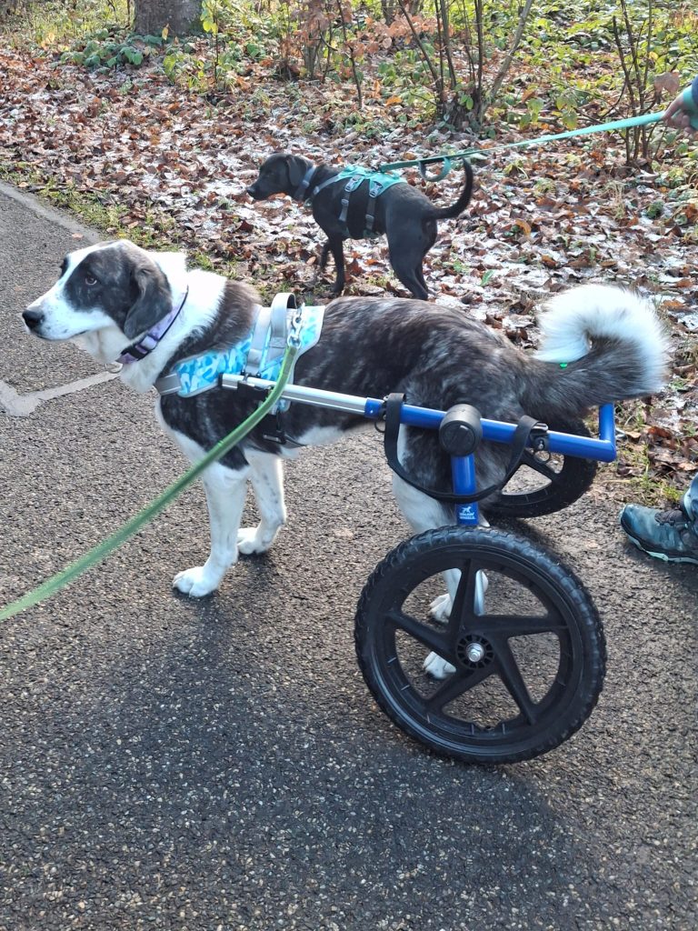 Wir konzentrieren uns nun deshalb darauf, ihre Muskulatur zu stärken. Dazu gehören unter anderem  Hydrotherapie (Schwimmen) und Spaziergänge mit dem Rolli. Giselle geniesst diese Spaziergänge im Rolli. Im Haus und im Garten kommt sie aber auch gut ohne Rolli klar.